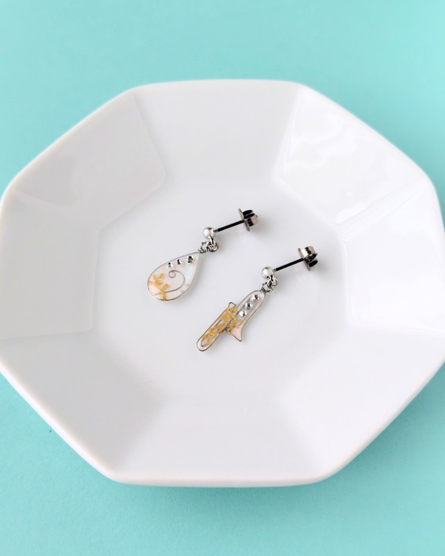 トロンボーンとへ音記号のピアスです。 アクセサリーワイヤーで形を作るところから始め、独自の方法による背景のパール塗装にゴールドの模様とこだわりのクリスタルを重ねました。 上品ながら存在感のある輝きをもつピアスとなっています。 演奏会のライトが当たる舞台の上で、耳元の輝きがあなたの楽器の音色を更に引き立てます。 楽器好きな方へのプレゼントにもおすすめです。 【金具】 チタンポストピアス(チタンキャッチ付き) ※オプションよりイヤリングへの変更も可能です。 【サイズ 】 トロンボーン : 2.9cm へ音記号 : 2.5cm (金具を含む)