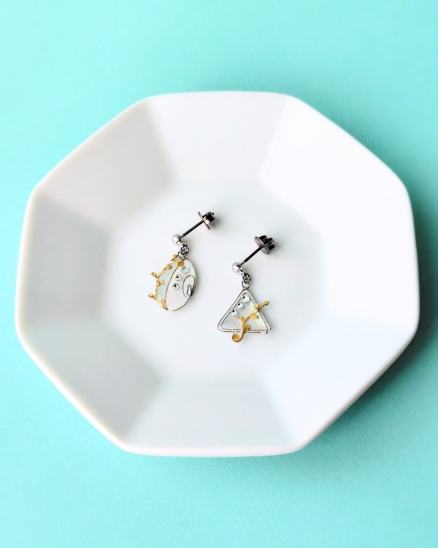 シンバルとトライアングルのピアスです。 アクセサリーワイヤーで形を作るところから始め、独自の方法による背景のパール塗装にゴールドの模様とこだわりのクリスタルを重ねました。 上品ながら存在感のある輝きをもつピアスとなっています。 演奏会のライトが当たる舞台の上で、耳元の輝きがあなたの楽器の音色を更に引き立てます。 楽器好きな方へのプレゼントにもおすすめです。 【金具】 チタンポストピアス(チタンキャッチ付き) ※オプションよりイヤリングへの変更も可能です。 【サイズ 】 シンバル : 2.3cm トライアングル : 2.4cm (金具を含む)