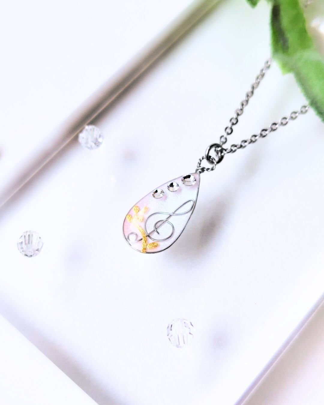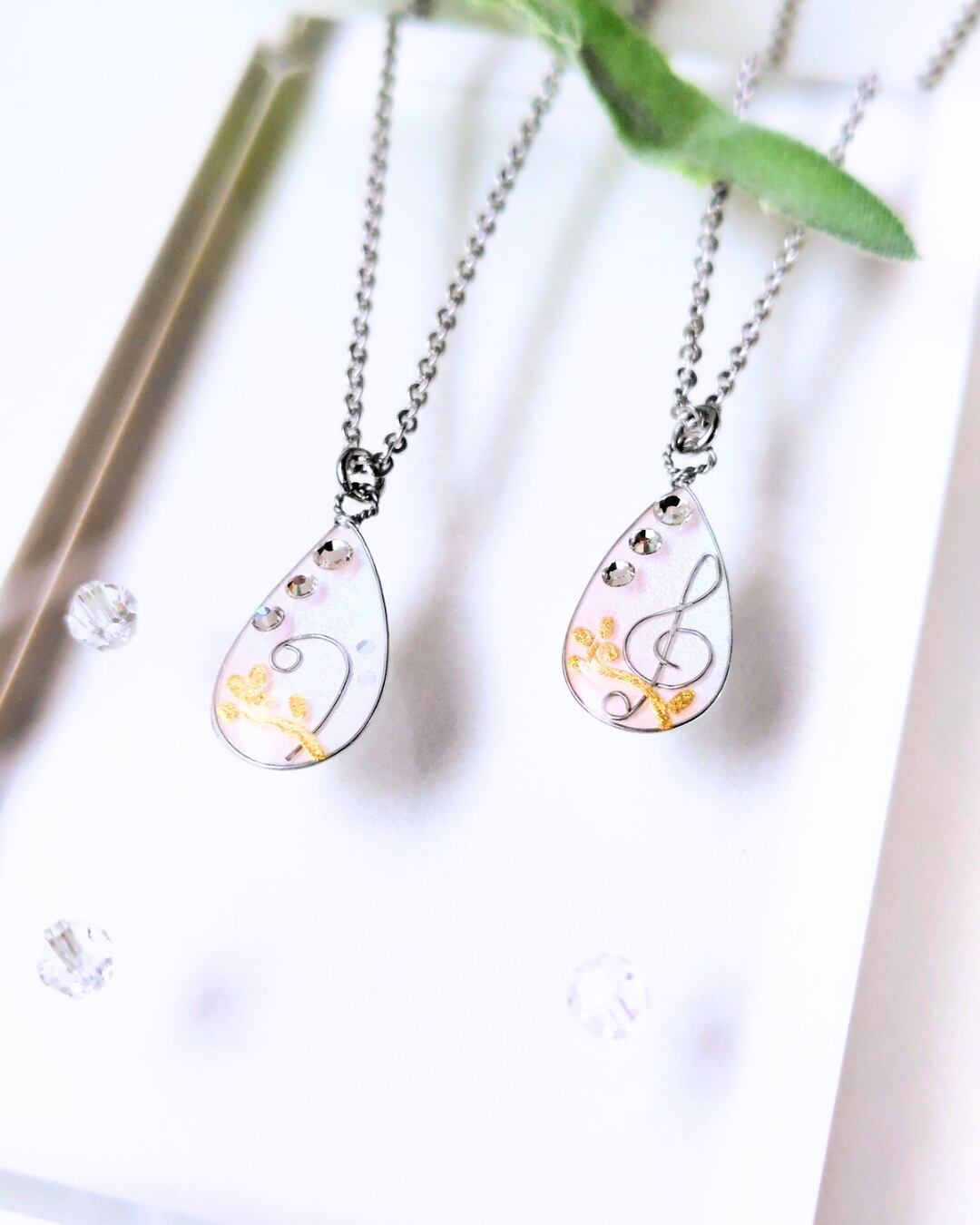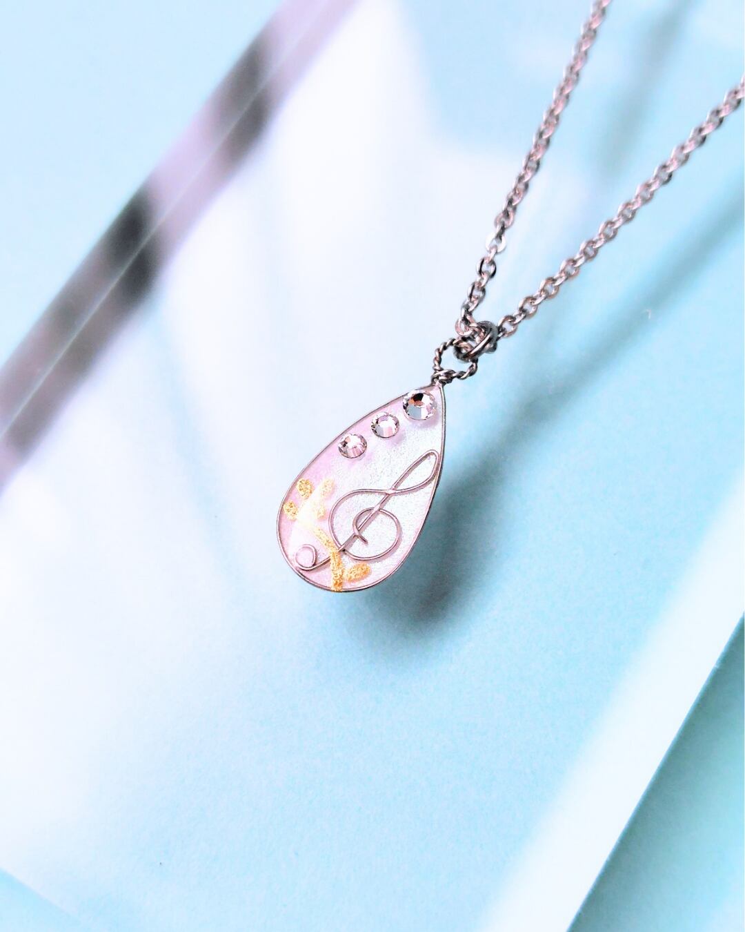 アクセサリーワイヤーでト音記号を形作り、背景のパール塗装に、ゴールドの模様とクリスタルを重ねました。