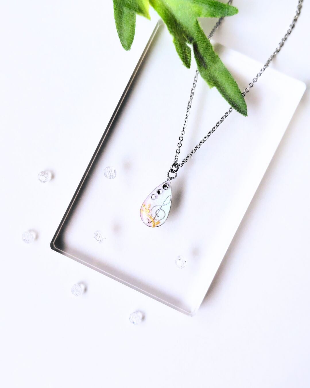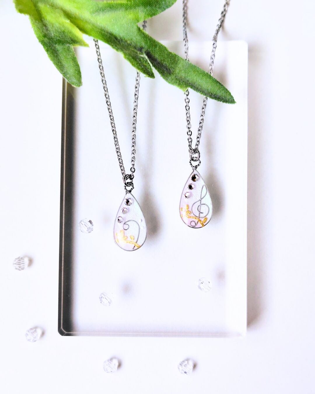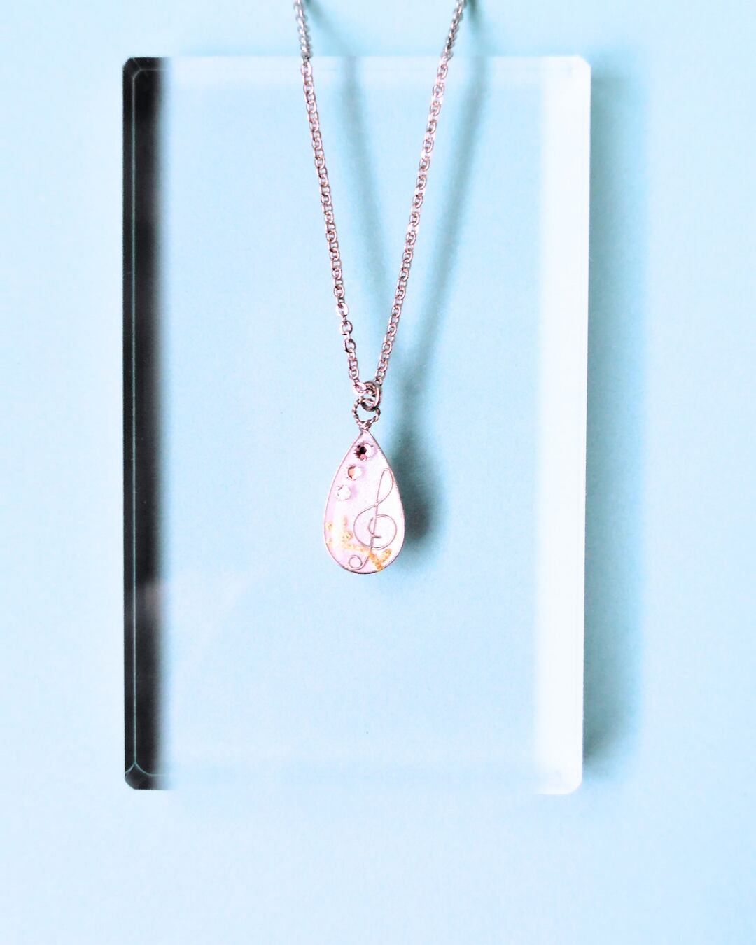 アクセサリーワイヤーでト音記号を形作り、背景のパール塗装に、ゴールドの模様とクリスタルを重ねました。